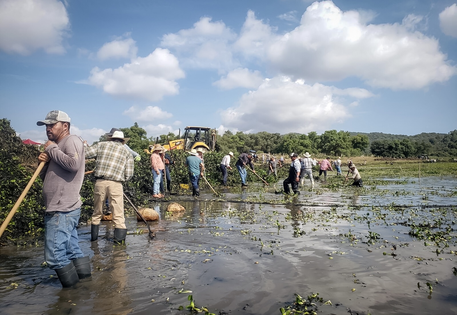 De igual forma, a través del uso de bieldos, los ejidatarios participantes llevan a cabo el retiro manual de la maleza y mediante la técnica de acamellonamiento del lirio acuático, éste se deshidrata con mayor velocidad mediante el apoyo de máquinas retroexcavadoras.