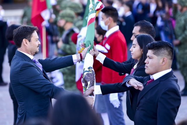 Presidió el evento cívico el titular de la Secretaría de Gobierno, Guillermo Olivares Reyna, en representación del gobernador Julio Menchaca Salazar, acompañado por integrantes del gabinete, quien abanderó a cuatro planteles educativos de nivel Medio Superior y Superior.