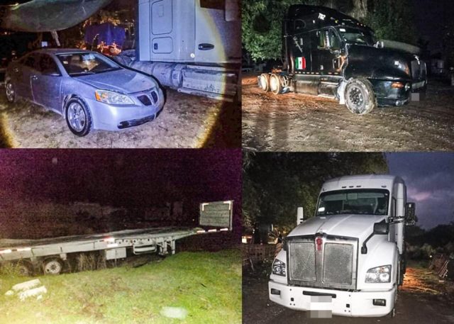 Al inspeccionar el lugar visualizaron un tractocamión color blanco, con placas de circulación 38AT6C, con visibles huellas de desvalijamiento, un tráiler color negro sin placas, automóvil tipo sedan marca Pontiac color gris sin placas, un remolque marca Lucio, una camioneta de 3 ½ toneladas cargada con contenedores de plástico placas de circulación KZ-48445, una camioneta color azul marino, una Avalanch color blanca con matrícula PAW-6984, una Dodge RAM color negra con gris y una motoneta de la marca Italika; todos ellos presuntamente con reporte vigente de robo.