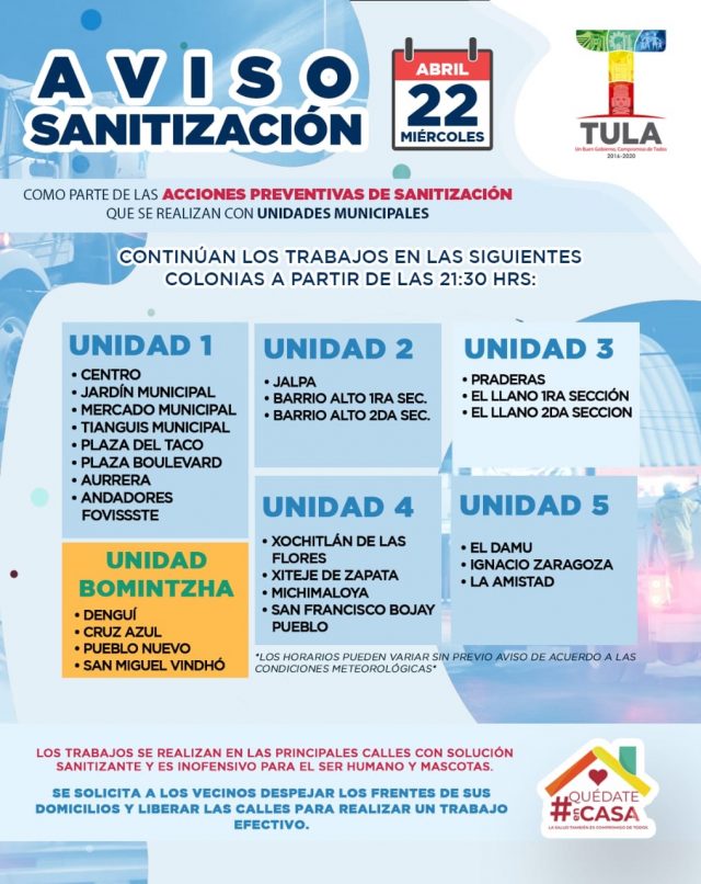 Inicio Municipios ⚠️ Aviso sanitización ⚠️⚠️ Miércoles 22 de abril ⚠️ Aviso sanitización ⚠️⚠️ Miércoles 22 de abril 22 de abril de 2020 FacebookTwitterPinterestWhatsApp De forma permanente en esta emergencia sanitaria, se realiza #sanitización con hipoclorito de sodio en principales calles y avenidas de colonias y comunidades del municipio. Hoy más que nunca #QuédateEnCasa #TulaTeNecesitaFuerte #TulaTeNecesitaSano
