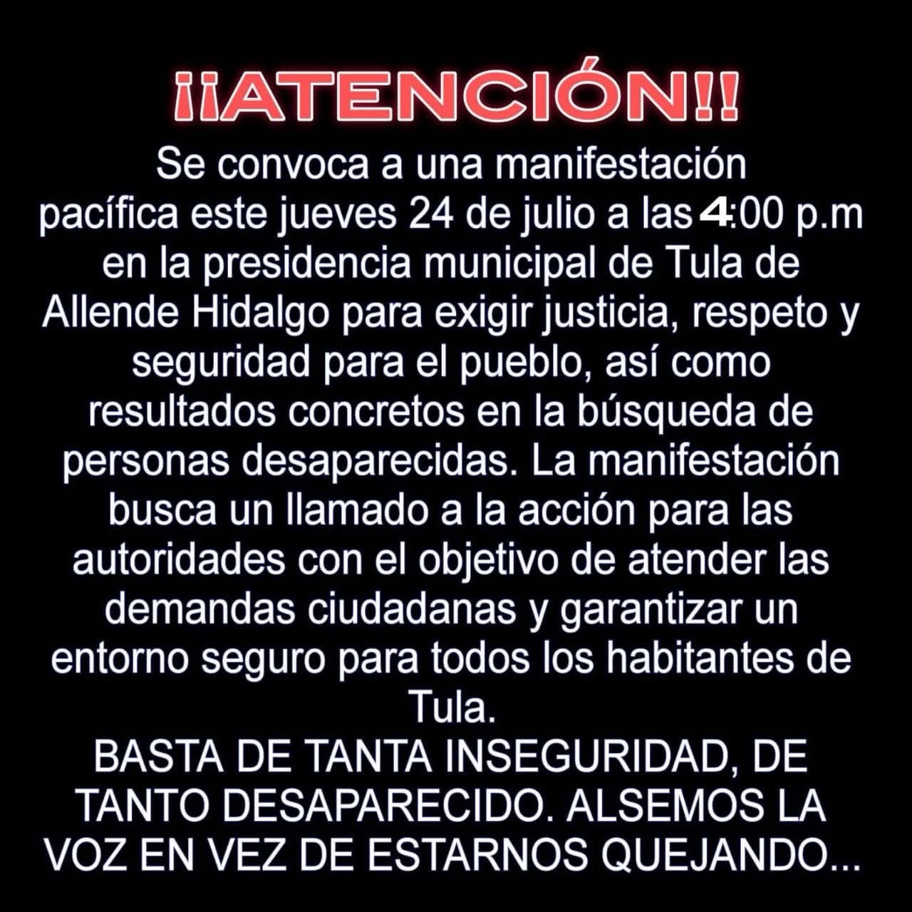 Tula de Allende, Hidalgo. — En medio de una creciente preocupación por la inseguridad que se vive en el municipio, ciudadanos de Tula convocaron a una manifestación pacífica este jueves 24 de julio a las 4:00 p.m. frente a la presidencia municipal, para exigir justicia, respeto y resultados concretos ante la desaparición de personas y la violencia que azota la región.
