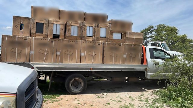En el lugar se aseguró un arma de fuego larga tipo fusil y una tipo pistola; dos cargadores, 34 cartuchos, seis mil 698 botellas de tequila de diversa marcas, mil 963 botellas de vodka, mil 104 botellas de whisky, 29 lavadoras con secadora, 24 estufas-parrilla, 17 lavadoras tipo tambor, 31 estufas de diferente tamaño, dos vehículos, una moto, una camioneta y una máquina retroexcavadora con pala y garra metálica.
