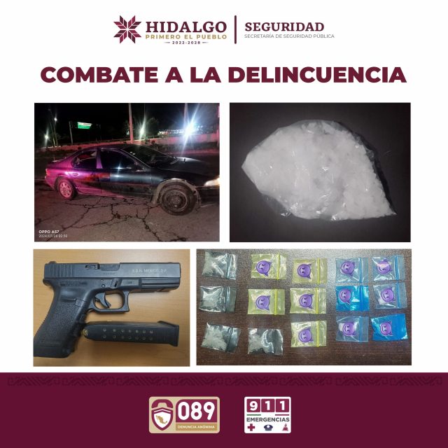 En tanto, en el municipio de Cuautepec de Hinojosa, durante patrullajes realizados en la colonia Tepantitla se intervino a una persona del sexo masculino de 24 años, de nombre A. M. H., a quien le fue encontrada una bolsa con 141 gramos de polvo blanco granulado con características del «cristal».