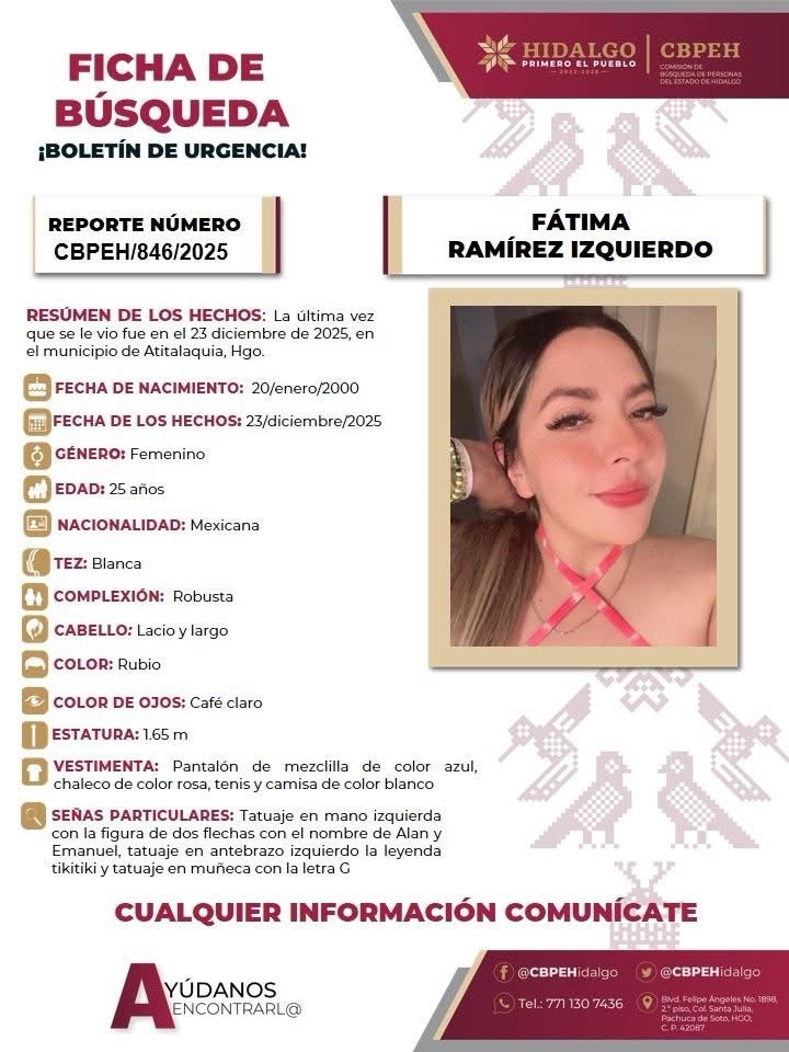 Atitalaquia, Hidalgo.— Tras cinco días de haber sido reportada como desaparecida, fue localizada sin vida Fátima Ramírez Izquierdo, confirmaron familiares de la joven. Su última localización conocida fue el 23 de diciembre en el municipio de Atitalaquia, lo que activó reportes de búsqueda en la región.