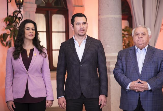 Durante el anuncio, el Gobernador se hizo acompañar de su equipo de trabajo, los secretarios de la Política Pública, Israel Félix Soto; Desarrollo Económico, José Luis Romo Cruz; Finanzas, Jessica Blancas; Medio Ambiente, Benjamín Rico; Obras Públicas, José Ventura Meneses y del Trabajo, María de los Ángeles Eguiluz.
