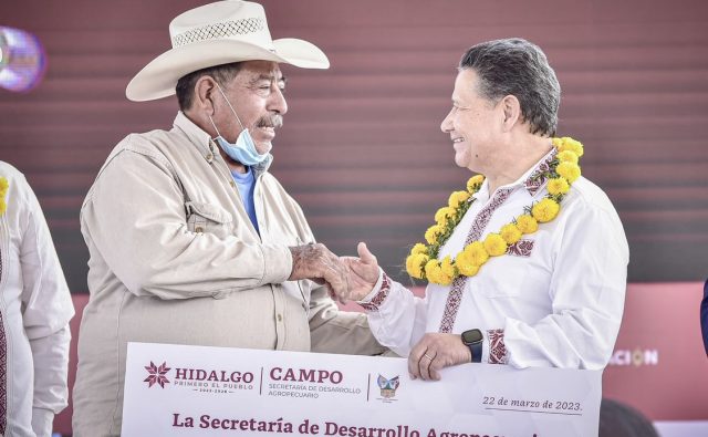 Menchaca Salazar acompañó al secretario González Pérez a la entrega de apoyos económicos agrícolas y pecuarios para el rescate del campo hidalguense, favoreciendo a 449 habitantes que vieron disminuidas sus cosechas a raíz de las condiciones climáticas.