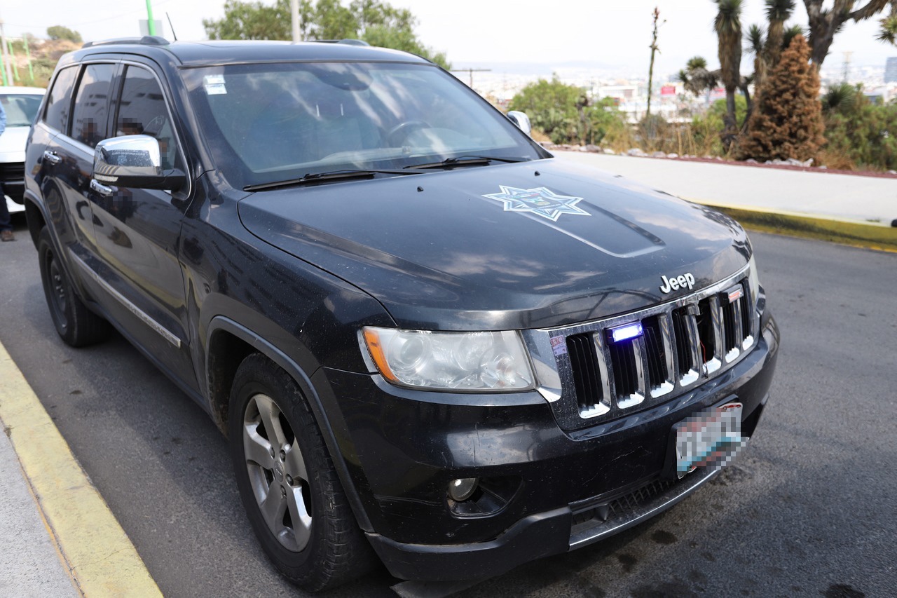 En los hechos, registrados en el municipio de Singuilucan, fue detectada y asegurada una camioneta Jeep Grand Cherokee, color negro, con placas de circulación del Estado de México, con logotipos policiales y dispositivos luminosos para vehículos policiales.