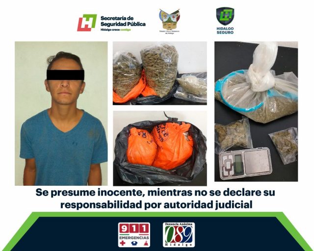 Agentes de la Secretaría de Seguridad Pública de Hidalgo aseguraron a un hombre con más de 2 kilogramos de probable marihuana en el municipio de Pachuca, como parte de las acciones de prevención y combate de actividades ilícitas.