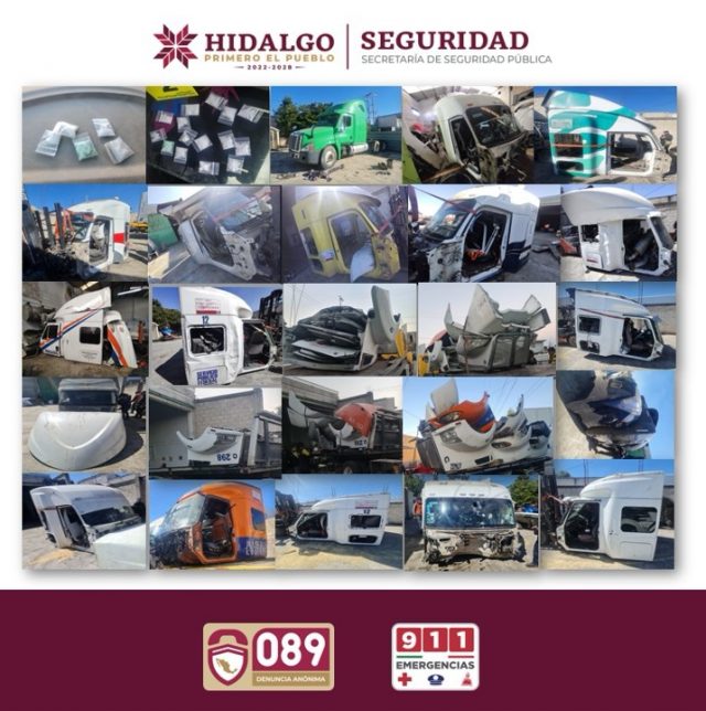 Tulancingo de Bravo, Hgo.- Elementos de la Secretaría de Seguridad Pública de Hidalgo (SSPH) aseguraron una bodega en la colonia Javier Rojo Gómez, en Tulancingo de Bravo, donde se desmantelaban tractocamiones con reporte de robo. Durante el operativo, se logró la detención de dos personas y la recuperación de un tractocamión, 20 cabinas y diversas autopartes.