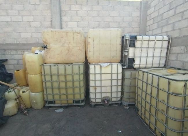 En uno de los domicilios cateados, las autoridades encontraron 26 depósitos con capacidad de mil litros, 50 bidones de 50 litros y 59 garrafones con residuos de hidrocarburo.