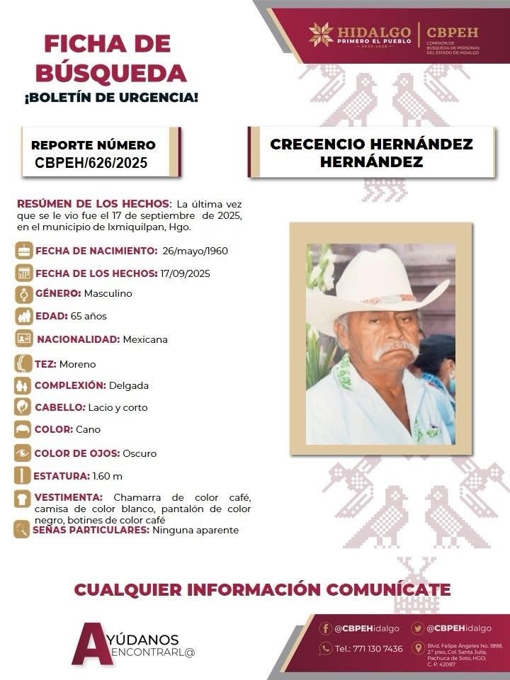 Ixmiquilpan, Hgo. — Por tercer día consecutivo, autoridades estatales y municipales mantienen un amplio operativo de búsqueda para localizar a Crescencio Hernández Hernández, de 65 años, reportado como desaparecido.
