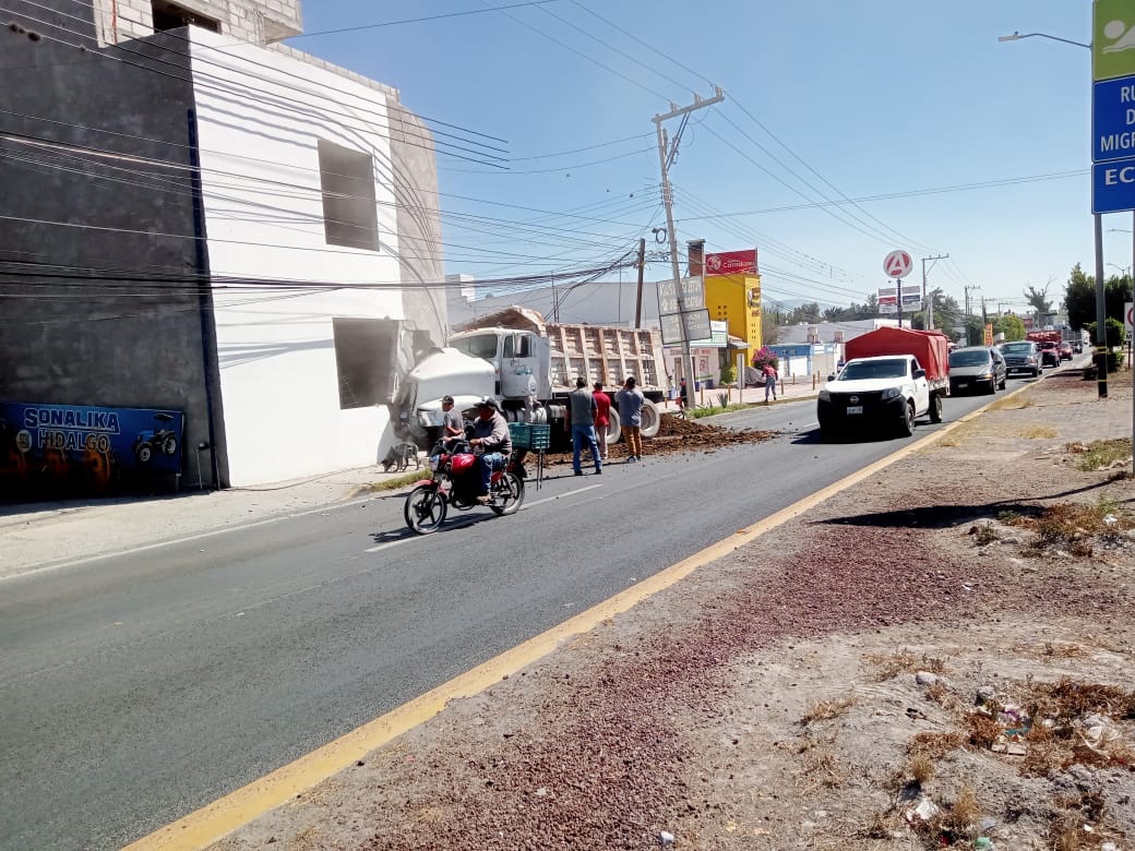 Ixmiquilpan, Hgo.— La tarde de este viernes, un camión se impactó contra una construcción en la Avenida Insurgentes, a la altura del barrio El Fitzhi.