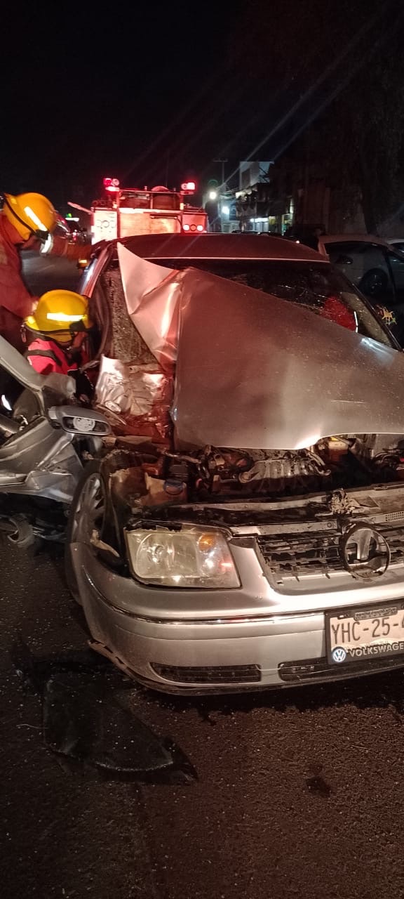 Elementos de rescate utilizaron equipo hidráulico para liberar a H.F.G., de 56 años, quien quedó atrapado dentro del automóvil compacto. La víctima fue trasladada a una clínica particular con múltiples contusiones.