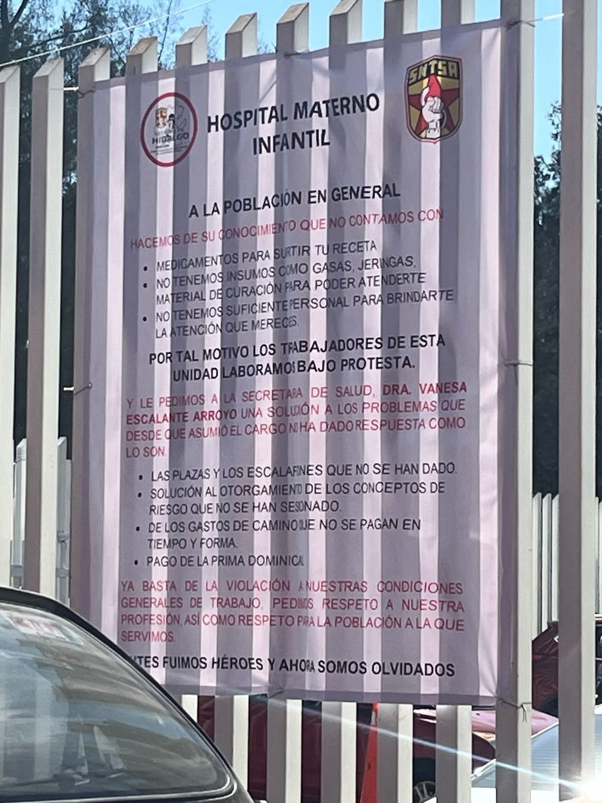 En paralelo, el personal del Hospital Materno Infantil de Pachuca protestó por la falta de insumos médicos y material de curación, situación que afecta la calidad de la atención. La problemática se ha extendido a otros hospitales, como el General de Pachuca, Tula, Tulancingo y el de Cinta Larga en Mixquiahuala, donde también se han reportado carencias en infraestructura y equipamiento.