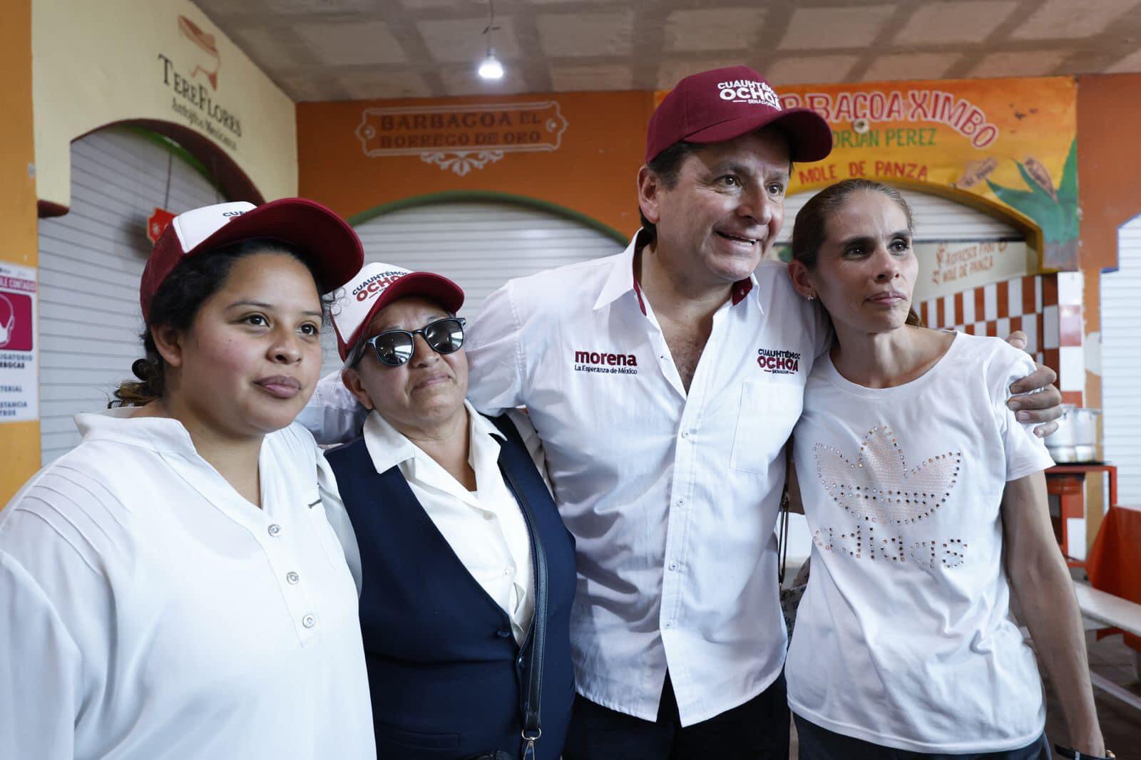 Durante su recorrido por el tianguis municipal, Cuauhtémoc Ochoa señaló que desde el Senado de la República impulsará las propuestas de Claudia Sheinbaum para que las mujeres de 60 a 64 años reciban un apoyo mensual, cuenten con el programa SOS Mujeres y se aperturen centros de educación inicial para mujeres jornaleras y de la maquila, así como la creación del Sistema Nacional de Cuidados en el DIF.