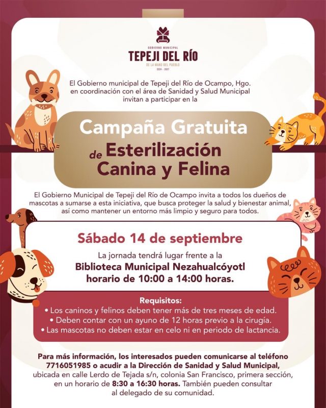El Gobierno Municipal de Tepeji del Río de Ocampo, Hgo. a través de la Dirección de Sanidad y Salud Municipal, hace un llamado a la ciudadanía, para participar en la Campaña Gratuita de Esterilización Canina y Felina.