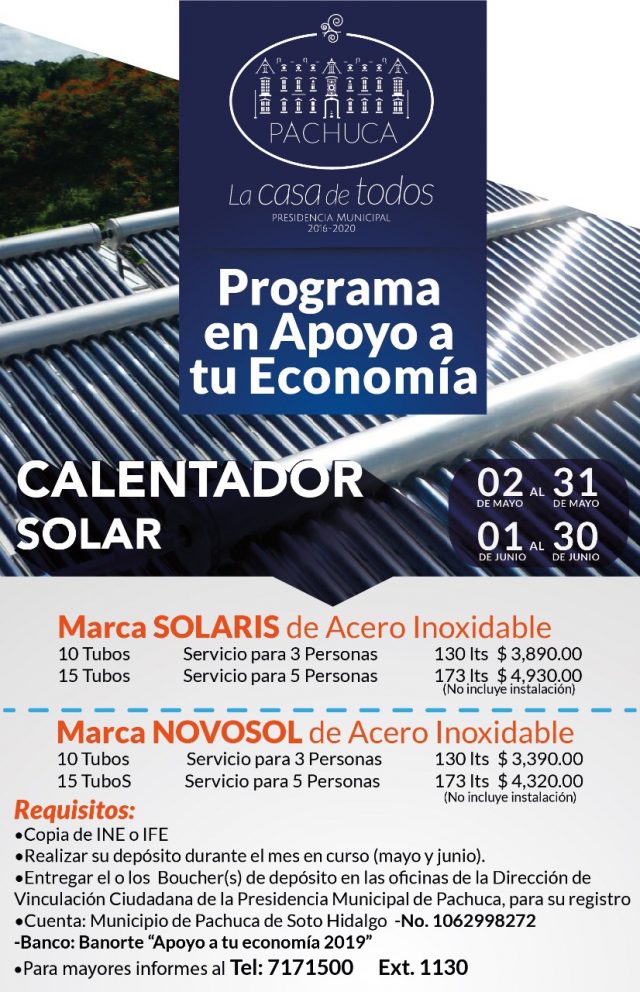 Con la finalidad de promover el cuidado ecológico y paralelamente, apoyar la economía de los pachuqueños, la Presidencia Municipal de Pachuca pone en marcha una campaña de uso de calentadores solares por medio de descuentos de hasta el 40 por ciento a través de la Dirección de Vinculación Ciudadana.