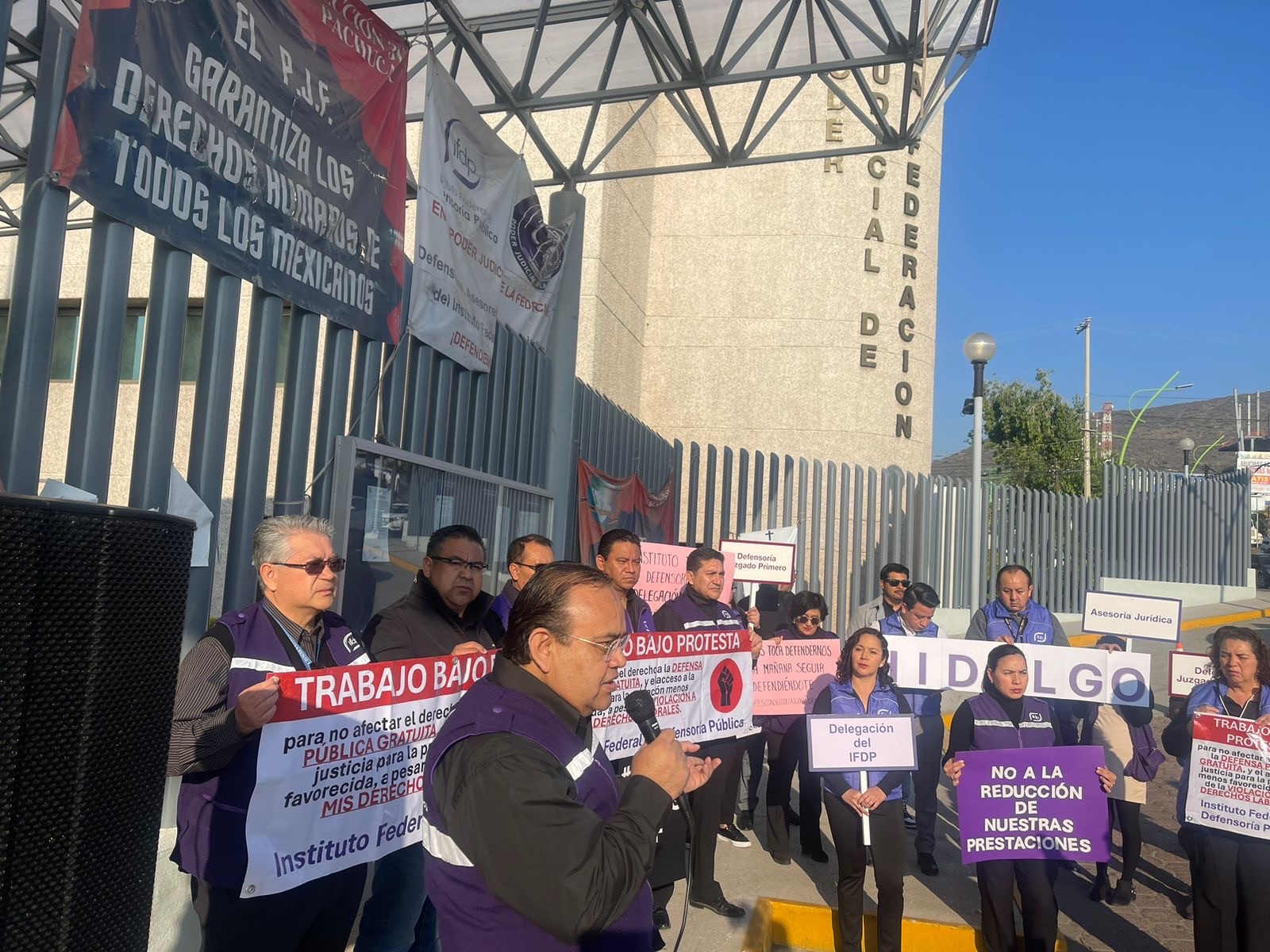 Trabajadores del Instituto de la Defensoría Pública Federal denunciaron afectaciones a sus prestaciones laborales derivadas de la reforma judicial. La protesta se llevó a cabo en el edificio sede del Poder Judicial de la Federación en Pachuca.