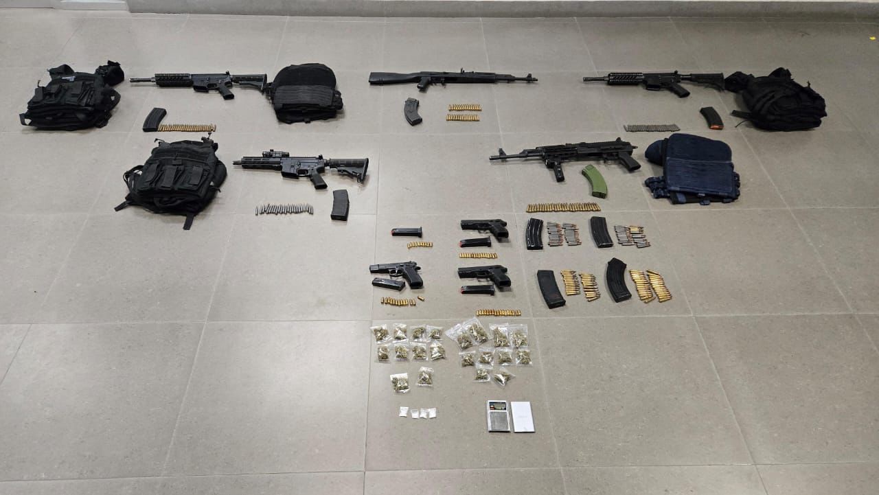 En el lugar, las autoridades aseguraron 200 dosis de marihuana, 13 dosis de droga sintética conocida como cristal, cinco armas largas, tres armas cortas, 206 cartuchos útiles, chalecos balísticos y una báscula de precisión.