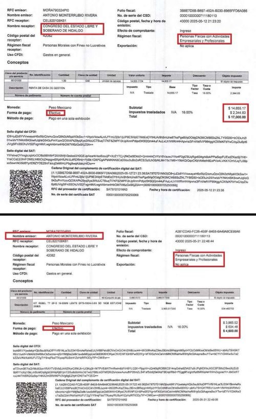 Precisó que, los documentos fueron utilizados para simular el arrendamiento de una casa de gestión en la colonia La Lomita, en Huejutla, donde presuntamente la legisladora tiene su oficina. En las facturas se reportan pagos mensuales por 17 mil pesos, además de la compra de equipo fotográfico, con comprobantes emitidos el 12 y el 31 de mayo de este año.