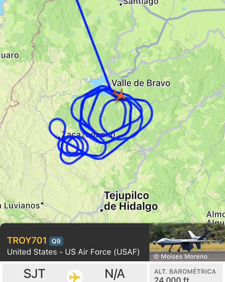Valle de Bravo, Estado de México.– Un avión no tripulado modelo MQ-9B “Guardian”, con el indicativo TROY701 y perteneciente a la Oficina de Aduanas y Protección Fronteriza de Estados Unidos, fue detectado la mañana de este martes en el espacio aéreo nacional.
