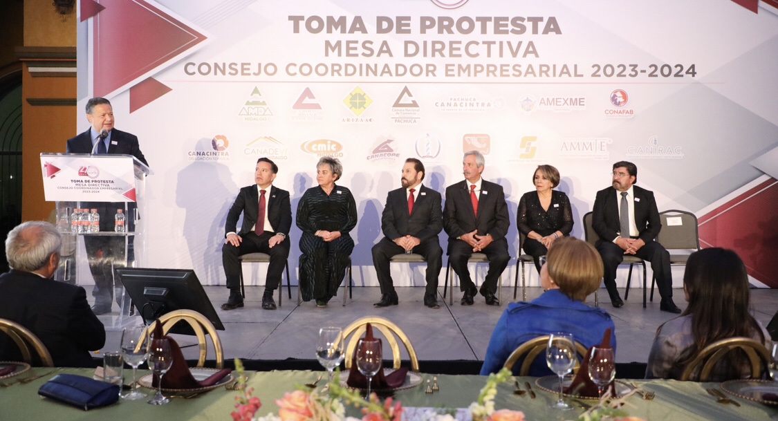 El gobernador Julio Menchaca Salazar, destacó que gracias al compromiso que caracteriza al sector privado, se seguirá trabajando de manera coordinada para alcanzar las expectativas de desarrollo humano y económico del pueblo hidalguense; esto, al tomar protesta a las y los nuevos integrantes de la mesa directiva del Consejo Coordinador Empresarial de Hidalgo (CCEH) para el periodo 2023-2024.