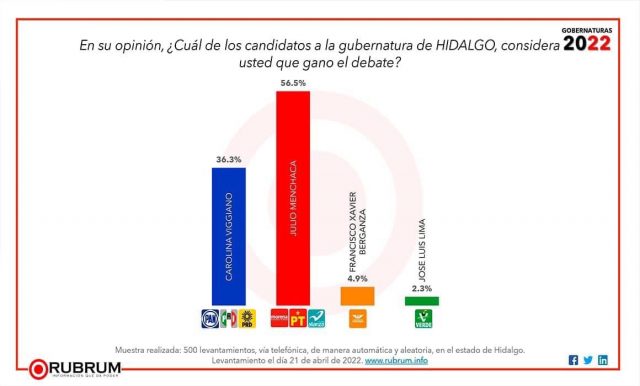 En el caso del sondeo telefónico realizado por la empresa Rubrum luego del debate entre aspirantes al gobierno de Hidalgo, el 56.5 por ciento de las personas entrevistadas consideraron que el candidato de Morena, PT y PNAH fue el ganador de este ejercicio democrático.