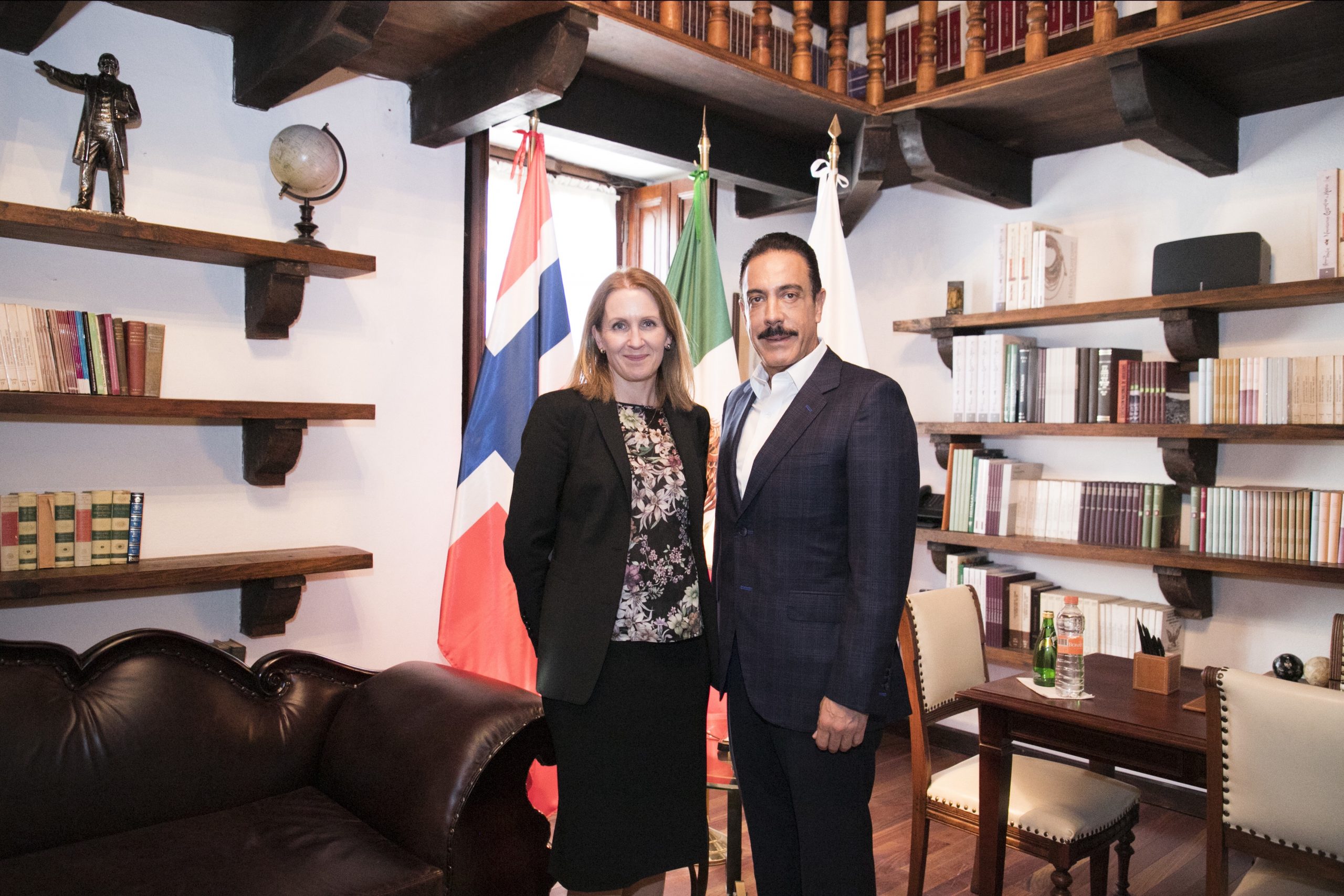 El gobernador Omar Fayad acompañado del secretario de la Política Pública Israel Félix y del titular de la Unidad de Planeación Lamán Carranza, sostuvo importante reunión de trabajo con la Embajadora de Noruega en México y Centroamérica Rut Krüger Giverin, para conocer la plataforma musical OII, desarrollada en el país europeo, para fortalecer el modelo educativo en Hidalgo, al ser la primera entidad federativa en utilizarla.