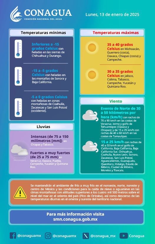 Este lunes 13 de enero de 2025, la Comisión Nacional del Agua (Conagua) informó que Hidalgo estará bajo condiciones de frío extremo, principalmente en zonas montañosas. Las temperaturas podrían descender hasta los 0 °C, con posibles heladas en la región.