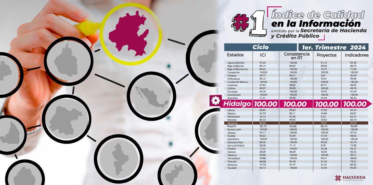 Es importante mencionar que Hidalgo se ha mantenido como líder con esta calificación, ya que en el reporte que le antecede, correspondiente al cuarto trimestre del 2023, fue la única entidad en lograr los 100 puntos en sus evaluaciones.