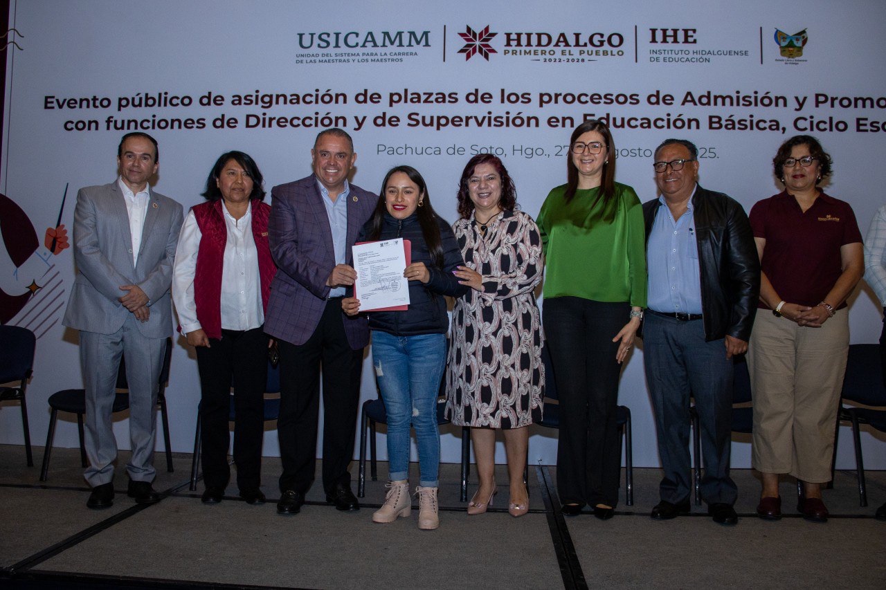 El Instituto Hidalguense de Educación (IHE) realizó el evento público de asignación de plazas correspondientes a los procesos de admisión y promoción en educación básica para el ciclo escolar 2025-2026, para entregar 82 plazas docentes de vacante definitiva, 675 horas-semana-mes a 30 docentes y 10 plazas de supervisor, director y subdirector.