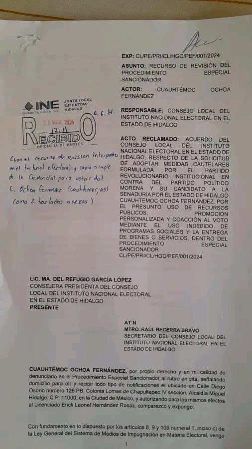 Tras el resolutivo del Consejo Local del Instituto Nacional Electoral (INE) de imponer una medida cautelar al candidato a senador de Morena, Cuauhtémoc Ochoa por el supuesto uso de programas sociales, el equipo jurídico del candidato impugnó dicha resolución, ya que