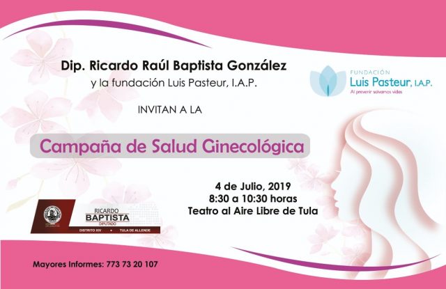 Como una medida de prevención a la salud de las mujeres de los municipios de Tula de Allende, Tlaxcoapan y Tlahuelilpan, el próximo 4 de julio se realizará la “Campaña de Salud Ginecológica” en el Teatro al Aire Libre de Tula, donde personal especializado de la Fundación Luis Pasteur, gracias a la gestión del diputado Ricardo Baptista González, realizarán estudios de Papanicolaou, Colposcopia, Prueba de Schiller y Vulvoscopía, para detectar oportunamente el Cáncer Cervicouterino.