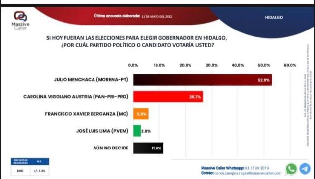 Así lo dio a conocer la encuestadora Massive Caller, en su sondeo “Intención de voto para elegir gobernador en Aguascalientes, Durango, Hidalgo, Oaxaca, Quintana Roo y Tamaulipas”, con corte al 11 de mayo.