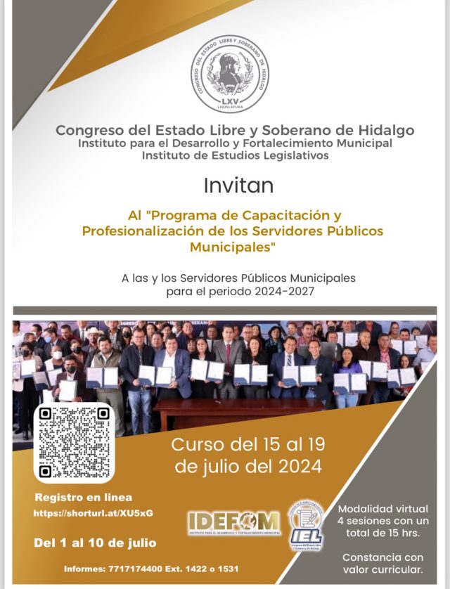 El día de hoy primero de julio de dos mil veinticuatro el Congreso del Estado Libre y Soberano de Hidalgo, a través del Instituto para el Desarrollo y Fortalecimiento Municipal, así como el Instituto de Estudios Legislativos, lanzo invitación al “Programa de Capacitación y Profesionalización de los Servidores Públicos Municipales” destinada a los servidores públicos municipales para el periodo 2024 – 2027.