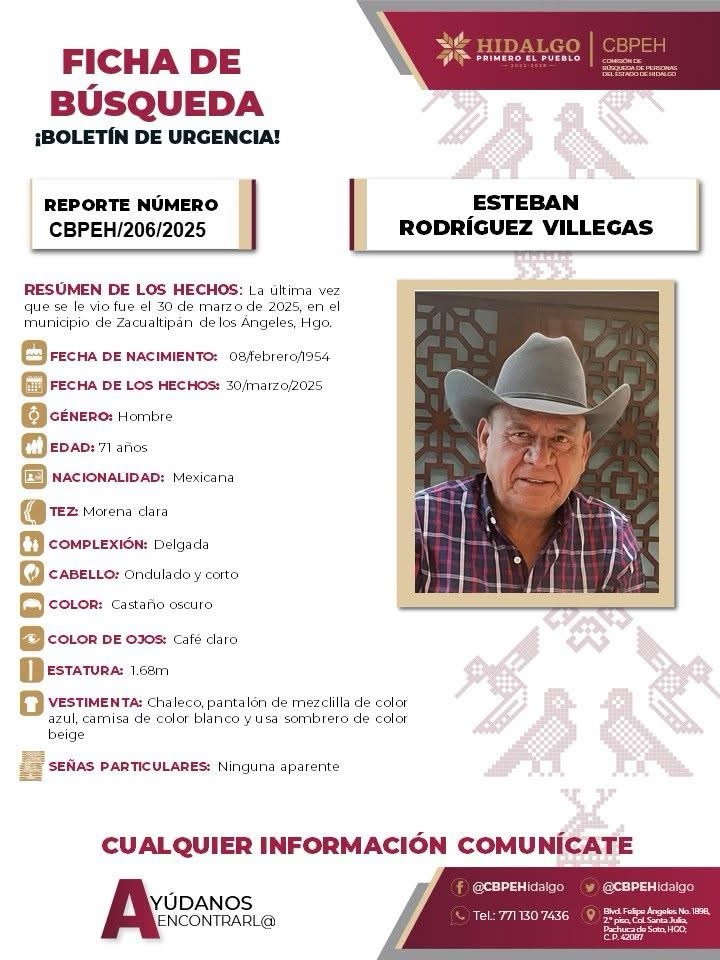 Esteban N. fue visto por última vez el pasado 30 de marzo, en Zacualtipán. Su familia, al no tener noticias de su paradero, promovió una ficha de búsqueda y emprendió una intensa movilización en la región para localizarlo.