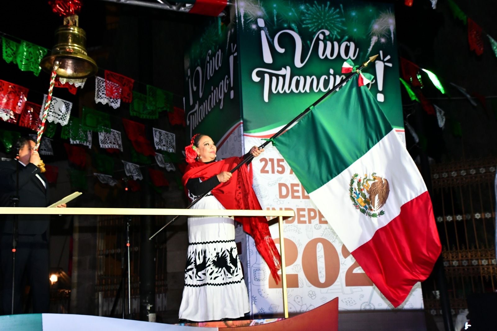 Después de hacer sonar la campana y ondear la bandera en el escenario principal habilitado a un costado de la Catedral Metropolitana de Tulancingo, la alcaldesa pronunció con voz firme la tradicional arenga y exalto a las heroínas y héroes que dieron patria y libertad a la nación.