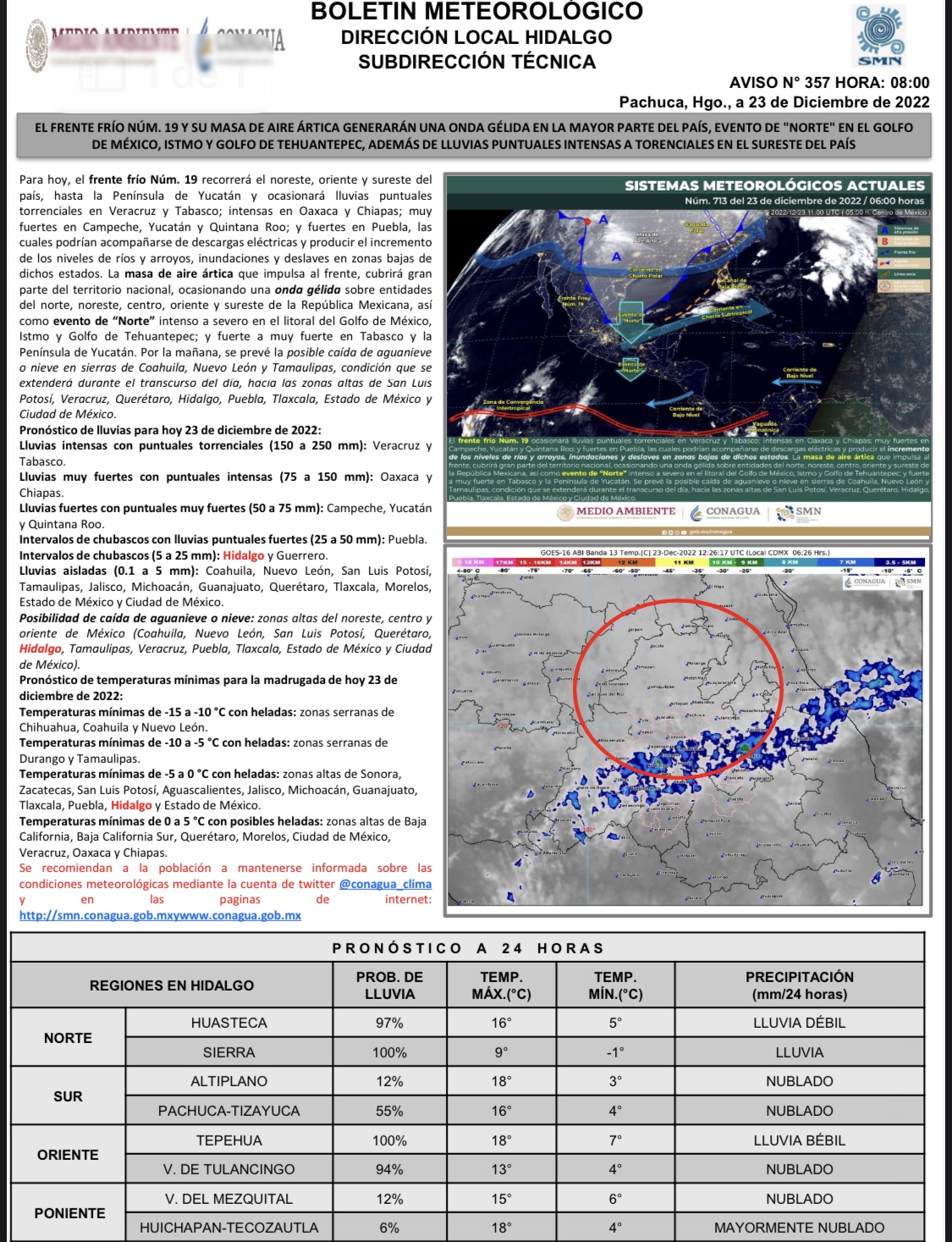 Se exhorta a la población a mantenerse informada sobre las condiciones meteorológicas mediante las páginas de internet www.gob.mx/conagua y https://smn.conagua.gob.mx, en las cuentas de Twitter @conagua_mx, @conagua_clima y @conaguaDL_HGO, y de Facebook www.facebook.com/conaguamx, así como en la aplicación para dispositivos móviles ConaguaClima, donde se puede consultar el pronóstico por municipio.