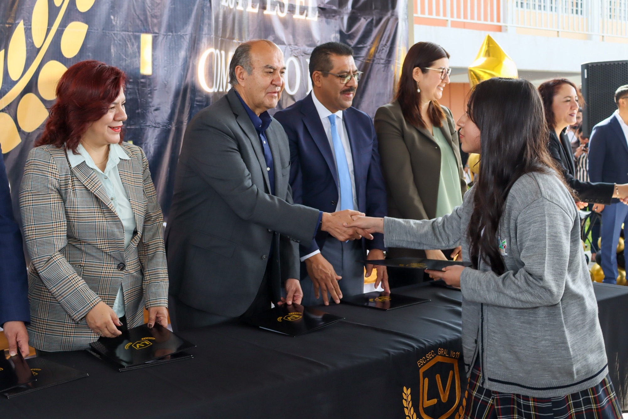 Durante la ceremonia de graduación de la generación 2022-2025, que incluyó el lunes cívico, Natividad Castrejón agradeció a Said Vargas, quien tuvo el honor de ser el padrino de generación, por el invaluable apoyo al sector educativo en este ciclo escolar.