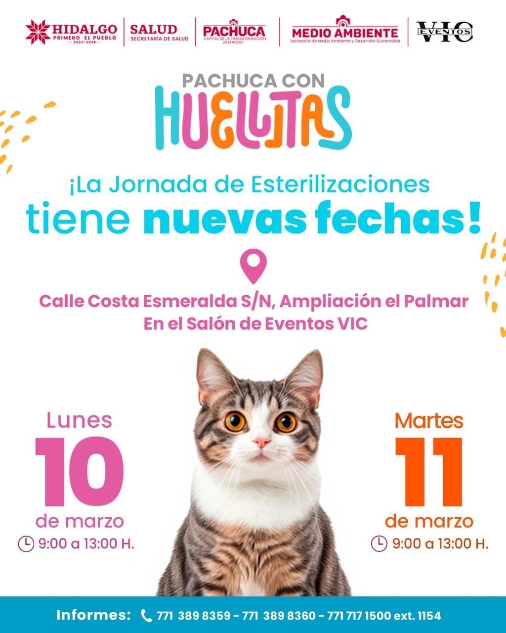 Los días 10 y 11 de marzo, la Presidencia Municipal de Pachuca, a través de la Secretaría de Medio Ambiente y Desarrollo Sustentable y en coordinación con el sector salud, llevará a cabo una nueva jornada de esterilización para perros y gatos en la colonia Ampliación El Palmar.