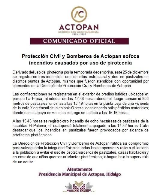Actopan, Hidalgo.— El uso de pirotecnia durante las celebraciones decembrinas provocó al menos tres incendios en distintos puntos del municipio de Actopan este 25 de diciembre, los cuales fueron controlados de manera oportuna por elementos de la Dirección de Protección Civil y Bomberos.