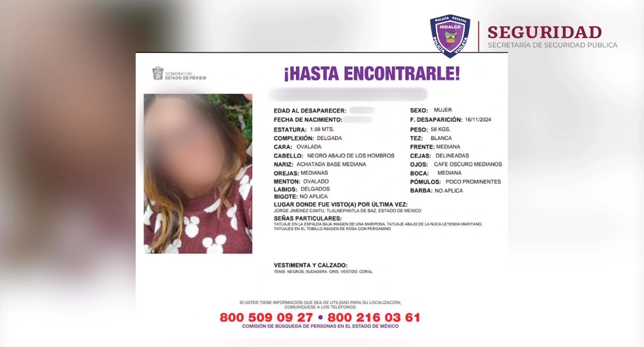 Pachuca.— Elementos de la Policía Violeta de la Secretaría de Seguridad Pública de Hidalgo (SSPH) localizaron y brindaron auxilio a una mujer reportada como desaparecida en el Estado de México desde hace nueve meses.
