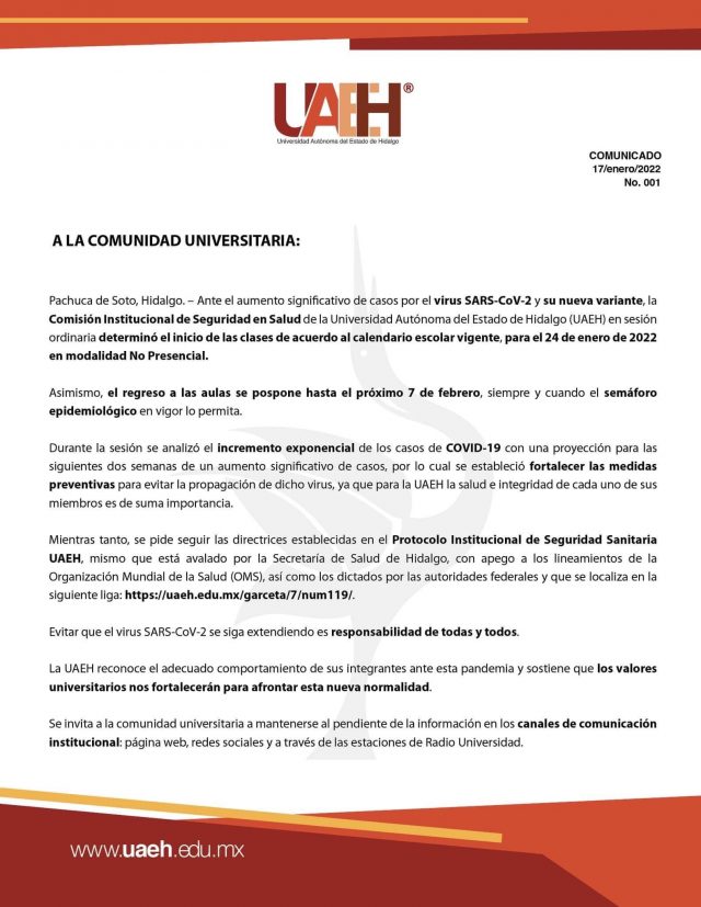 Inicio De todo Posponen reinicio de clases presenciales en la #UAEH hasta el siete de... Posponen reinicio de clases presenciales en la #UAEH hasta el siete de febrero por contagios de Covid19 馃 18 de enero de 2022 FacebookTwitterPinterestWhatsApp
