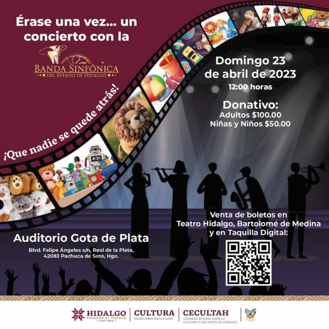 El Cecultah invitó a la población en general a asistir a “Érase una vez… un concierto con la Banda Sinfónica del Estado de Hidalgo” e informó que las y los interesados aún pueden adquirir sus boletos, con donativo de 100 pesos para personas adultas y 50 para niñas y niños, en las instalaciones del Teatro Hidalgo Bartolomé de Medina, con sede en plaza Juárez, de 9:00 a 17:00 horas, o a través de la taquilla digital de la dependencia estatal: https://taquilla.cecultah.gob.mx/events/concierto-infantil-matinee/.