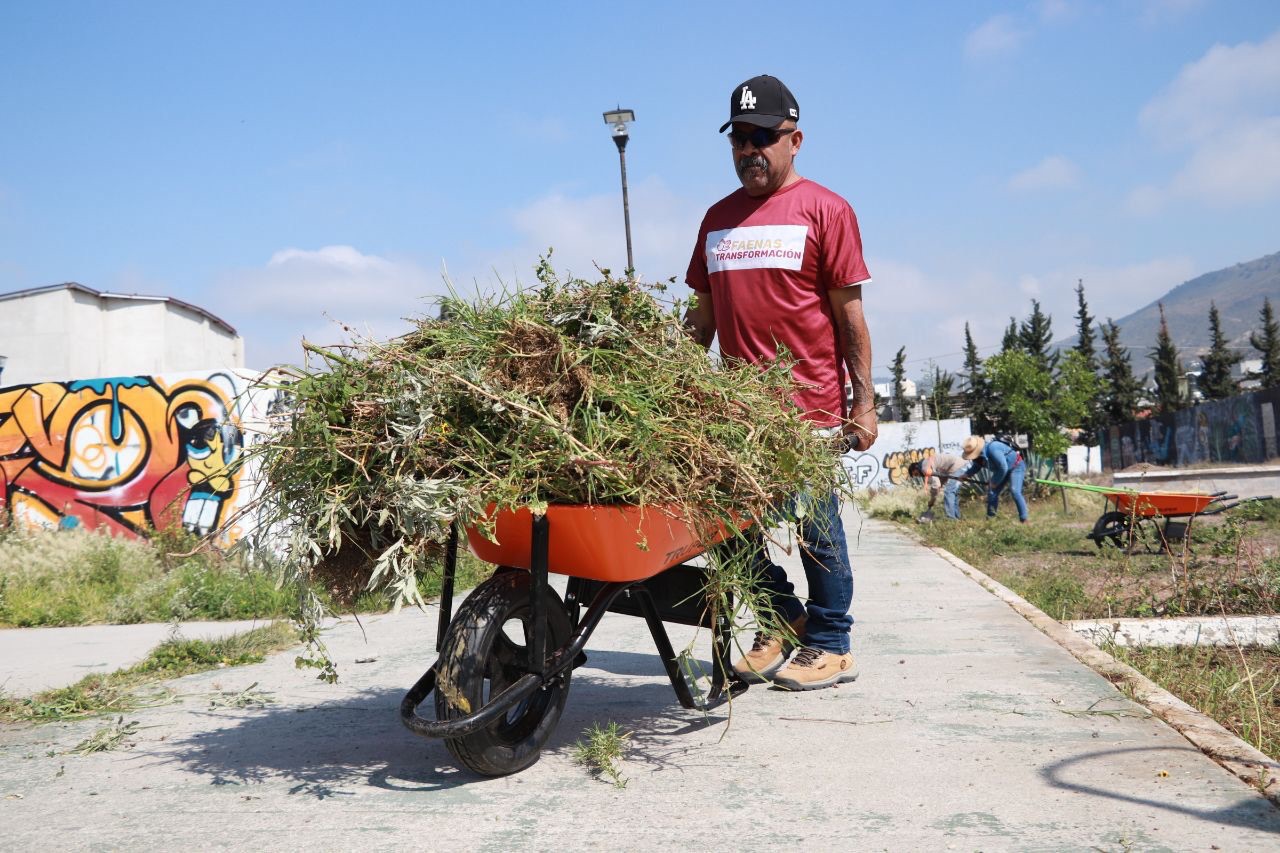 El parque de la colonia Plutarco Elías Calles quedó limpio de maleza toda vez que llegaron las Faenas por la Transformación que desde el inicio de la administración impulsa el alcalde Jorge Reyes.