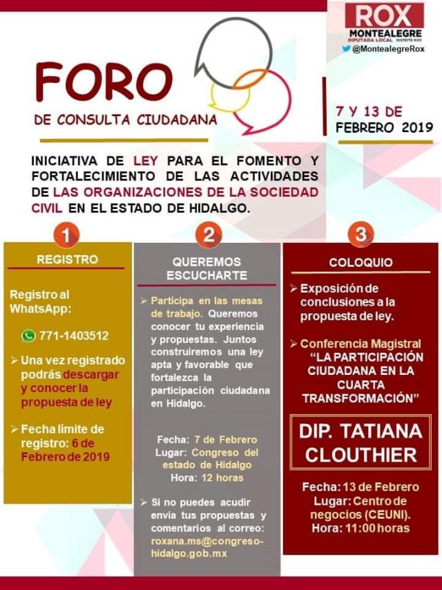 Para lograr este diálogo estamos organizando una Foro de Consulta Ciudadana dividido en dos actividades: la primera es invitar a la ciudadanía a participar en las mesas de trabajo que se realizarán el jueves 7 de febrero dentro de las instalaciones del Congreso del Estado. El acceso es gratuito y cualquier ciudadano interesado puede participar, basta con obtener su registro en el celular 771-1403512 o a través de la página de Facebook de Roxana Montealegre Salvador.