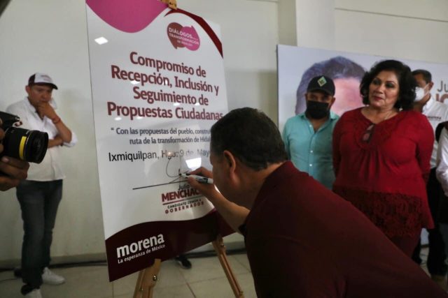 Al término de su mensaje, el candidato firmó el “Compromiso de Recepción, Inclusión y Seguimiento de Propuestas Ciudadanas”. Puntualizó que: “Con las propuestas del pueblo, construiremos la ruta de la transformación de Hidalgo”.