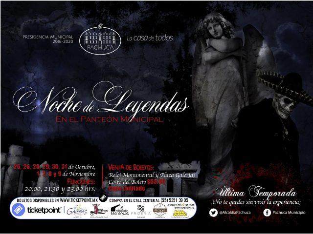 En ocasión de la celebración de Día de Muertos y con la intención de preservar y difundir nuestras tradiciones, la Presidencia Municipal a través de la Secretaría de Desarrollo Económico llevará a cabo a partir del 25 de octubre y hasta el 9 de noviembre la Séptima Temporada de Noche de Leyendas en el Panteón Municipal.