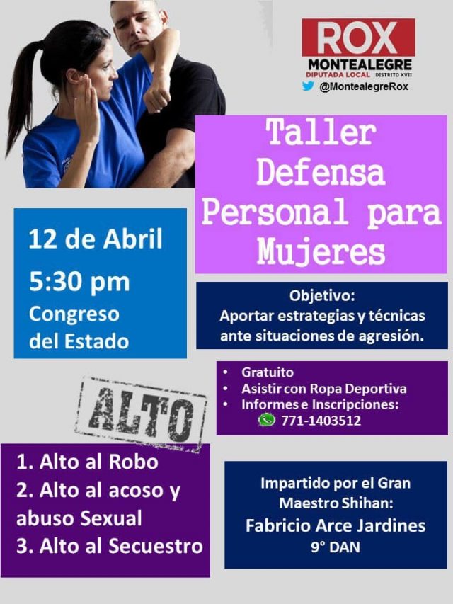 Debido a la inseguridad que se vive en la zona metropolitana de Pachuca, la diputada Roxana Montealegre Salvador invita a las mujeres al taller de defensa personal que se realizará el viernes 12 de abril a las 5 de la tarde en las instalaciones del Congreso del Estado de Hidalgo.