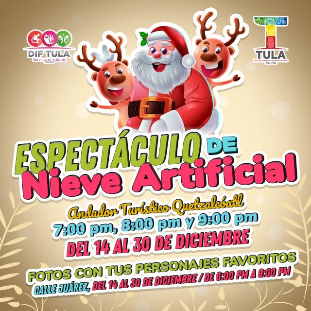 #Tula #EnFamiliaYConValoresVivamosLaNavidad Te esperamos con tu familia en el andador turístico Quetzalcóatl a vivir la navidad con la nieve artificial. A partir de este sábado 14, todos los días hasta el 30 de diciembre en horario de 7:00, 8:00 y 9:00 pm. Además en calle Juárez, tómate la foto con tus personajes favoritos de las 6:00 pm a las 9:00 pm.
